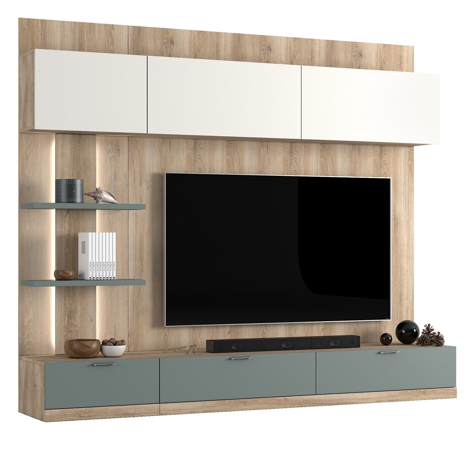 Deze grote cinewall komt uit de serie Asola. De asola serie is een woonkamer programma die uit meerdere kasten, cinewall en tafels bestaat en onderscheid zich met zijn eiken hout gecombineerd met wit en lichtblauw kleur. Samen met de metalen handgrepen is deze meubel stijlvol afgewertk en is het een lust voor het oog.