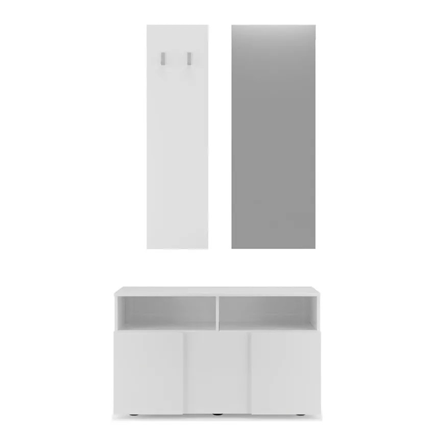Deze halmeubelset is mooi afgewerkt in de kleur hoogglans wit. Dit garderobeset Dama bestaat uit 3 elementen: 1 spiegel, 1 kapstokpaneel en 1 schoenenbank. De schoenenbank is voorzien van 2 open vakken en 1 deur met daar achter legplanken waarop u de schoenen of andere spullen kunt plaatsen.
