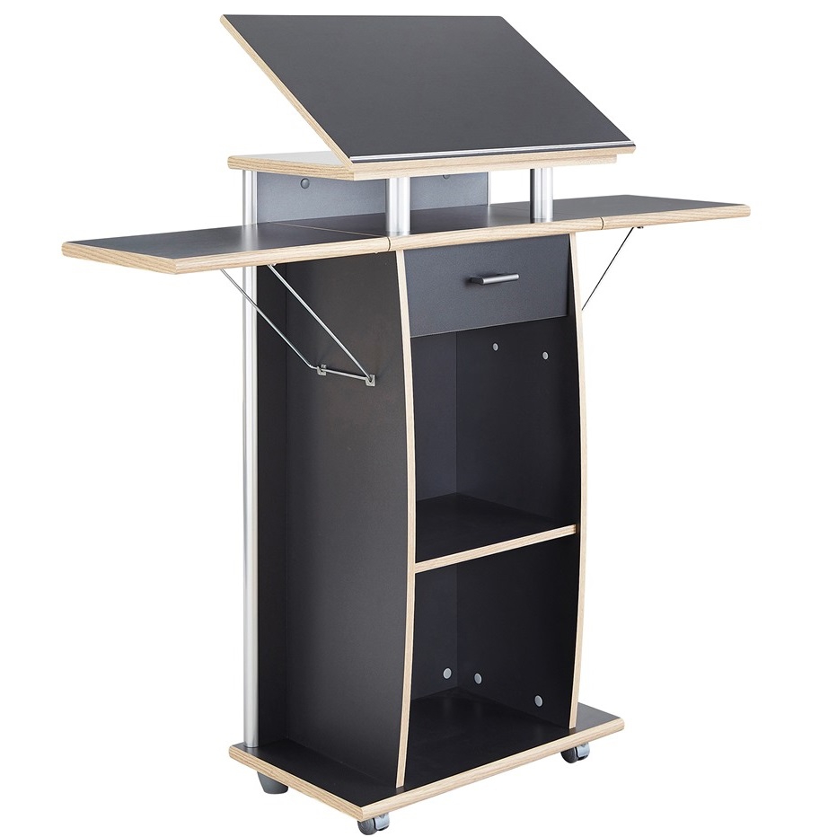 Deze Lectern heeft aan de zijkanten extra 2 bovenbladen waardoor het in de breedte uitklapbaar is. Het bovenblad kunt u ook instellen om bijvoorbeeld presentaties te geven op grote metingen of vergaderingen.