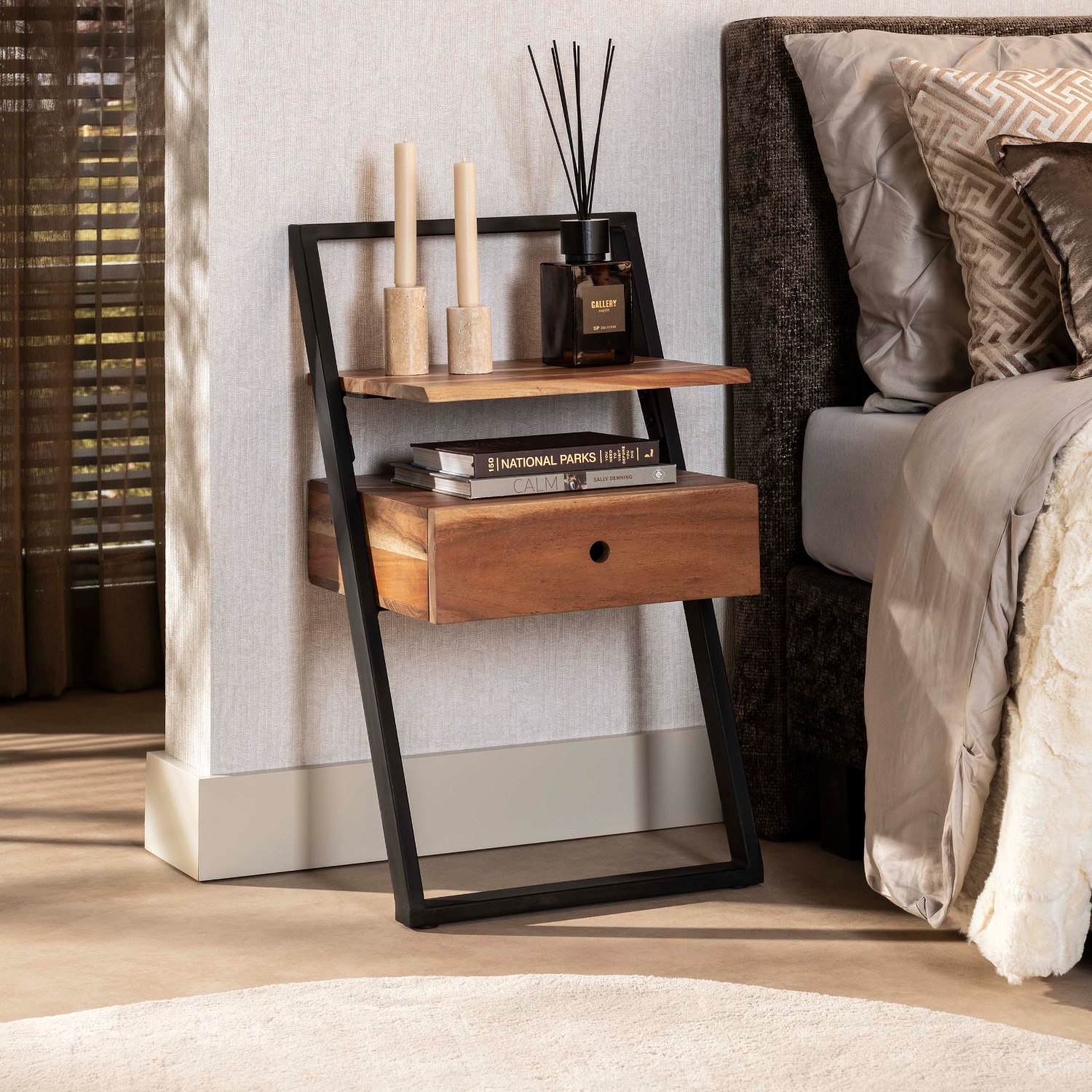 Dit trendy nachtkastje ‘lean’ is uitgevoerd in acacia hout en gepoedercoat metaal. Het nachtkastje dient tegen de muur te staan en heeft 2 schroefgaatjes voor extra stevigheid. Dit nachtkastje is geschikt voor naast ieder bed! Ook is het kastje uitgevoerd in een TV-meubel.