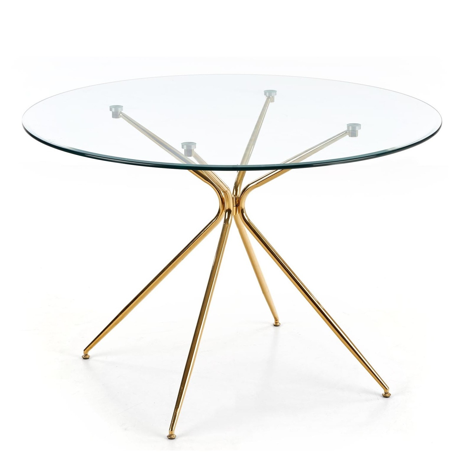 Deze prachtige ronde eettafel RONDO heeft een transparante veiligheidglas blad van 110 cm. Dankzij de goud kleur onderstel is het een ware aanwinst voor uw eetkamer.