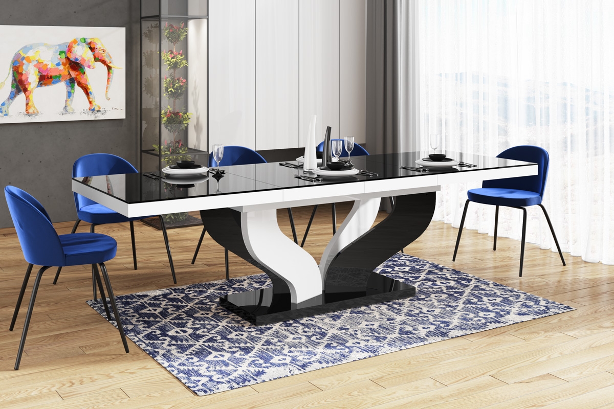 Uitschuifbare eettafel Viva 160 tot 256 cm breed in hoogglans zwart met wit