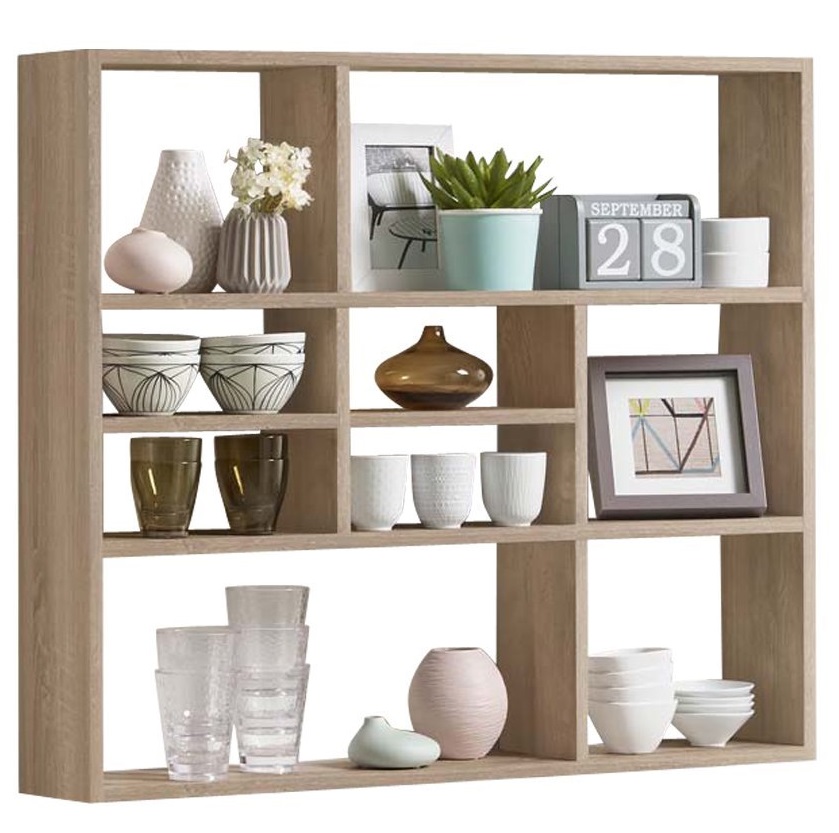 Wandrek Lussy in eiken decor is een stijlvol modern boekenrek voor aan de wand met 9 open vakken in verschillende maten en vormen. Een ware blikvanger voor aan uw wand. Geschikt voor uw boeken en woonaccessoires. De kast kan zowel staand als liggend aan de wand gemonteerd worden.